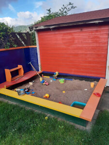 Zur Wohnung gehört auch ein Garten der mit Spielgeräten und Hochbeeten ausgestattet ist, indem ich mit den Kids Obst und Gemüse anbaue.