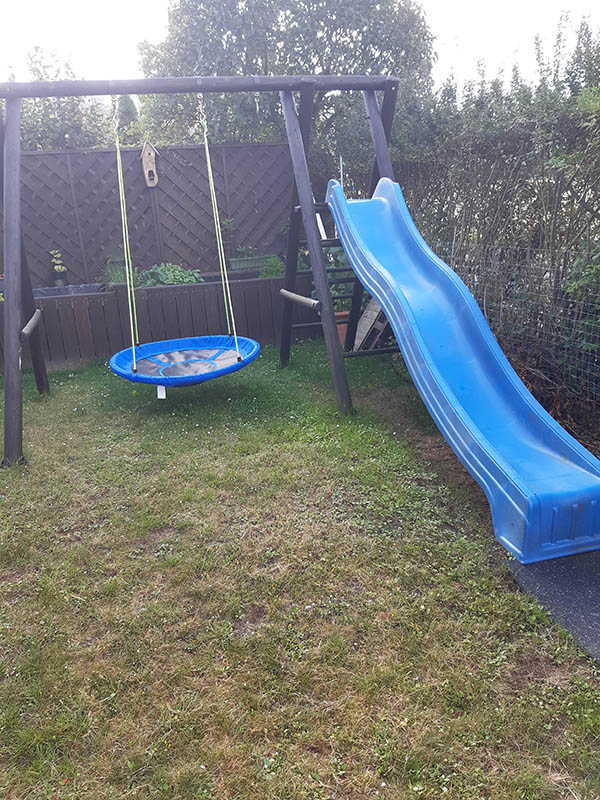 Zur Wohnung gehört auch ein Garten der mit Spielgeräten und Hochbeeten ausgestattet ist, indem ich mit den Kids Obst und Gemüse anbaue.