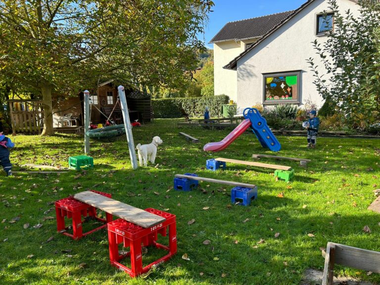 Ein großzügiges Außengelände: Ein eingezäunter Garten bietet Platz zum Austoben, Spielen, Experimentieren und Erforschen der Natur. Hier gibt es auch ein Gemüsebeet, Blumenbeet und verschiedene Beerensträucher. Alles, was kriecht und krabbelt, wird genaustens untersucht.