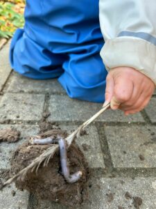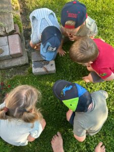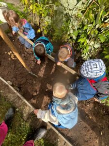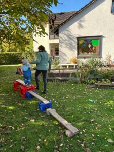 Ein großzügiges Außengelände: Ein eingezäunter Garten bietet Platz zum Austoben, Spielen, Experimentieren und Erforschen der Natur. Hier gibt es auch ein Gemüsebeet, Blumenbeet und verschiedene Beerensträucher. Alles, was kriecht und krabbelt, wird genaustens untersucht.